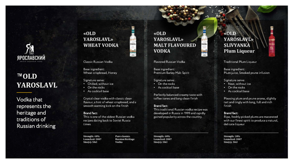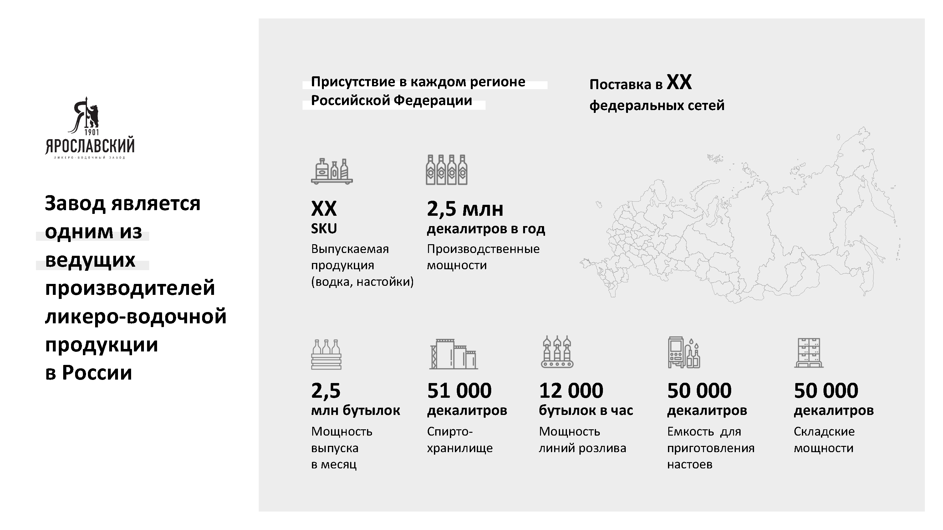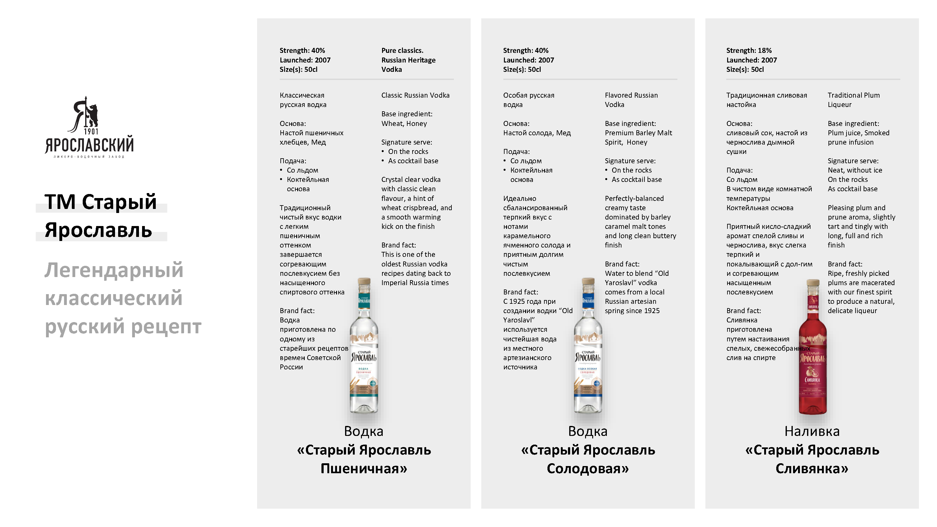 We were asked by Yaroslavl Distillery to design and define the structure and content of their pitch deck both in Russian and English.