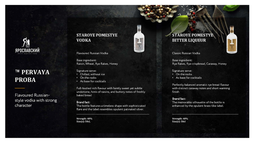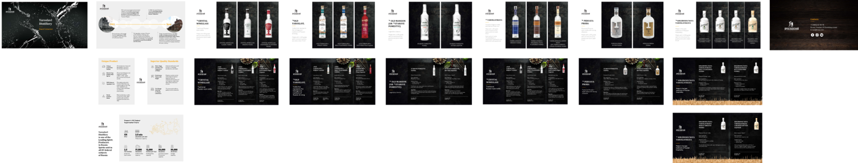 We designed a modern, creative and informative pitch deck which Yaroslavl Distillery can now use in their external communication with foreign partners and as supplementary material distributed along with their commercial offer.